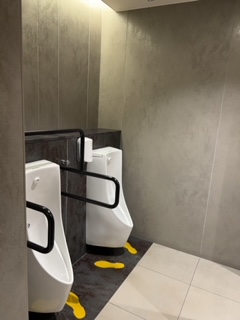 便器の数は少なかったのですが、間接照明や落ち着いた色の壁だったため居心地はとてもよかったです。小便器の足型はたまにあるのですが、黄色という鮮やかな色を用いてたため、トイレの雰囲気とのギャップもあり、個人的には別の色でもよかったんじゃないかな?と思いました😂それほどきれいに使ってほしいという願いがあるのかも!